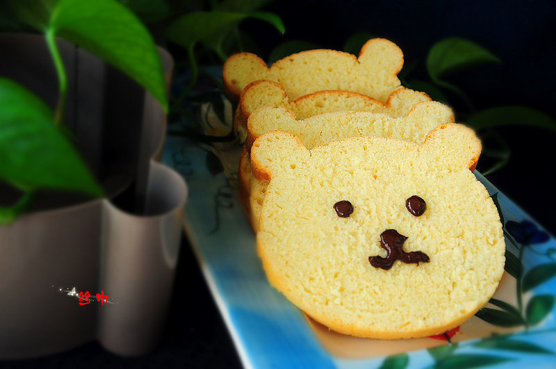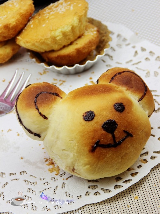 9:烤好的小熊面包,切片后,就可以用融化的巧克力,画上自己喜欢的图案了。