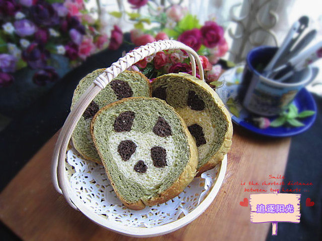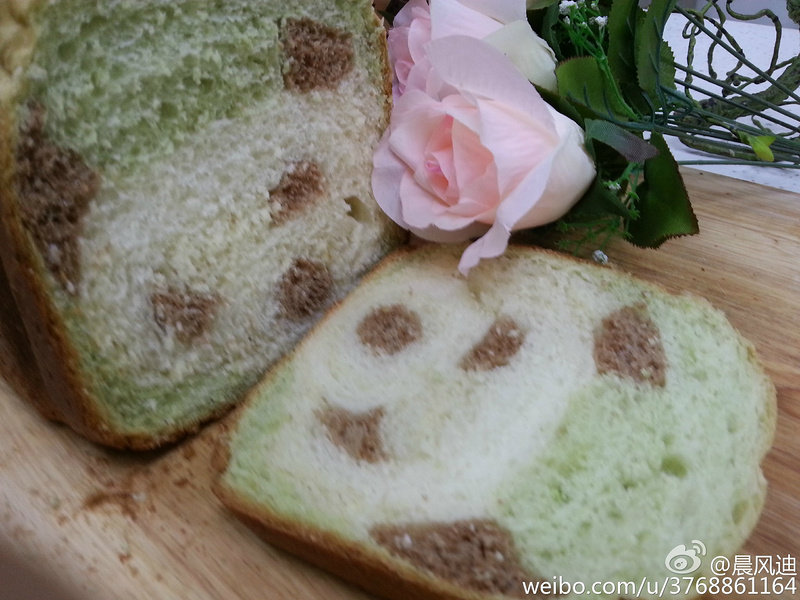 小贴士:1、巧克力面团和抹茶面团揉好后,210g普通面团也一定要揉搓排气;这样一起醒发时,三个面团才一样;最后发酵的效力才一样!2、制作这款熊猫面包时要注意面团的分配和卷法;熊猫嘴巴以下面的面团不能卷太厚,不然就不能形成明细的五官!