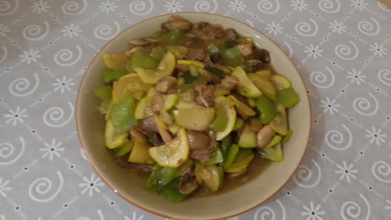 牛肉50g;白蘑菇100g;青椒2个;西葫芦1个;