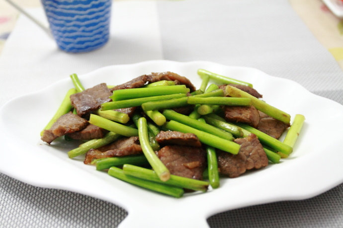 新鲜牛肉250g;蒜苔250g;盐4g;生抽1勺;油3勺;花椒10粒;