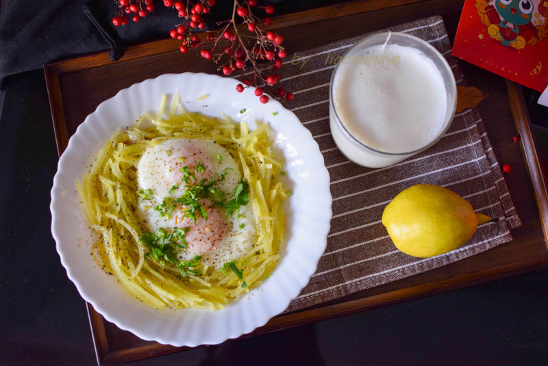 用筷子戳开鸡蛋,就能看到里面的溏心,溏心蛋 土豆丝一起送入口中,酸酸的、香香的、嫩嫩的。也可以加进吐司里,变身营养丰富的三明治。