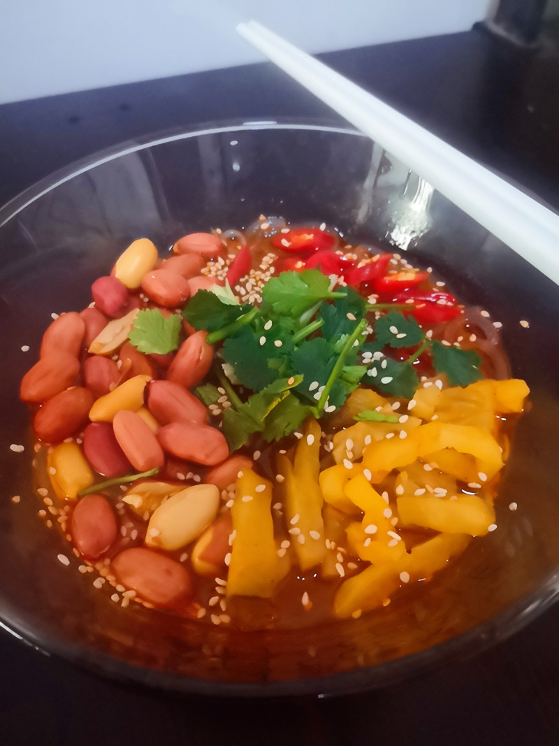 8:将煮熟的红薯粉捞出,加入芫荽、葱、蒜泥(我之前切好用芝麻油和盐制好封存放在冰箱里的)、为省事我没有额外炸花生米、豆子和芝麻就用了一勺香辣脆(三样东东里面都有)。麻油、花椒油。拌匀上桌即食。