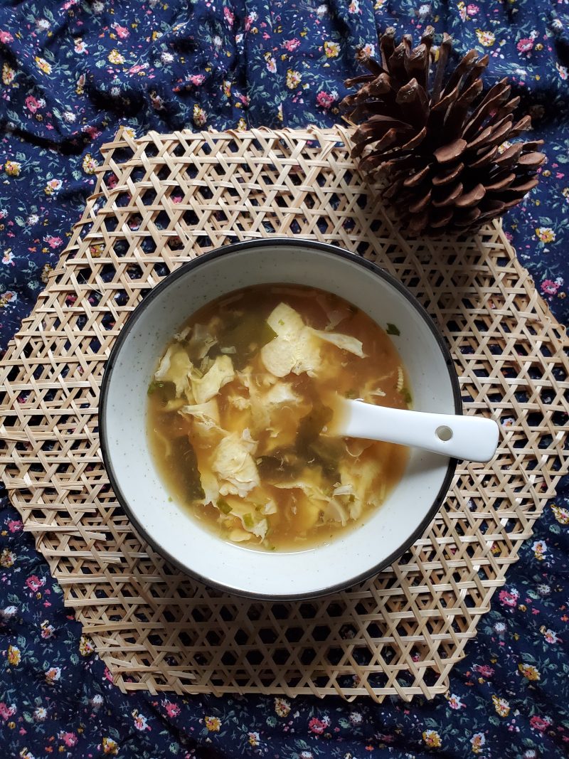 1:康宝港式酸辣浓汤1包,鸡蛋1个