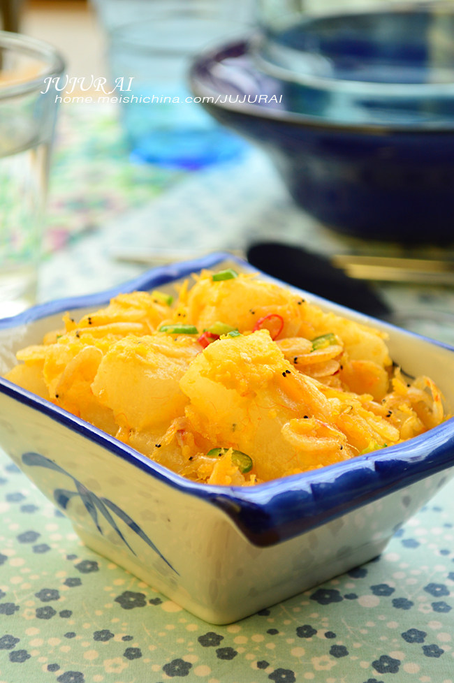 10:待冬瓜条均匀的裹上蛋黄汁后放虾皮