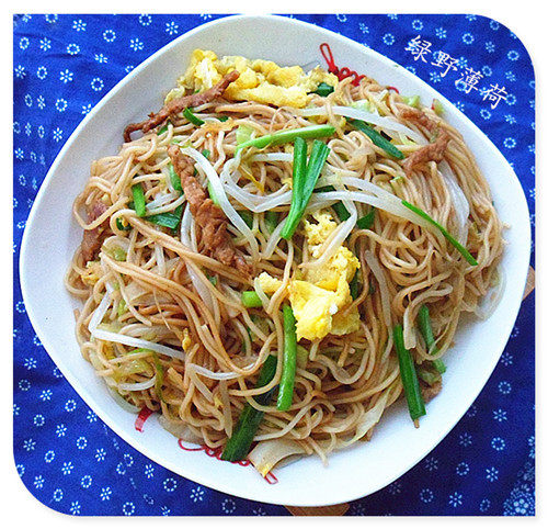 炒面条(外购蒸熟的)适量;绿豆芽适量;洋白菜适量;韭菜适量;肉丝适量;鸡蛋适量;