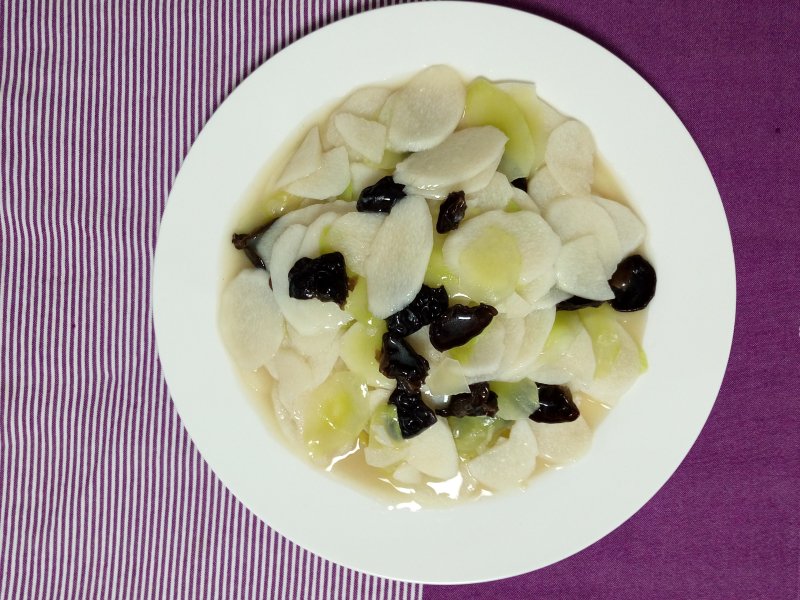 4:锅内加底油,葱爆锅,加入山药,加米醋,食盐和清水,大火翻炒至断生,加入木耳和莴笋片,翻炒出锅装盘。
