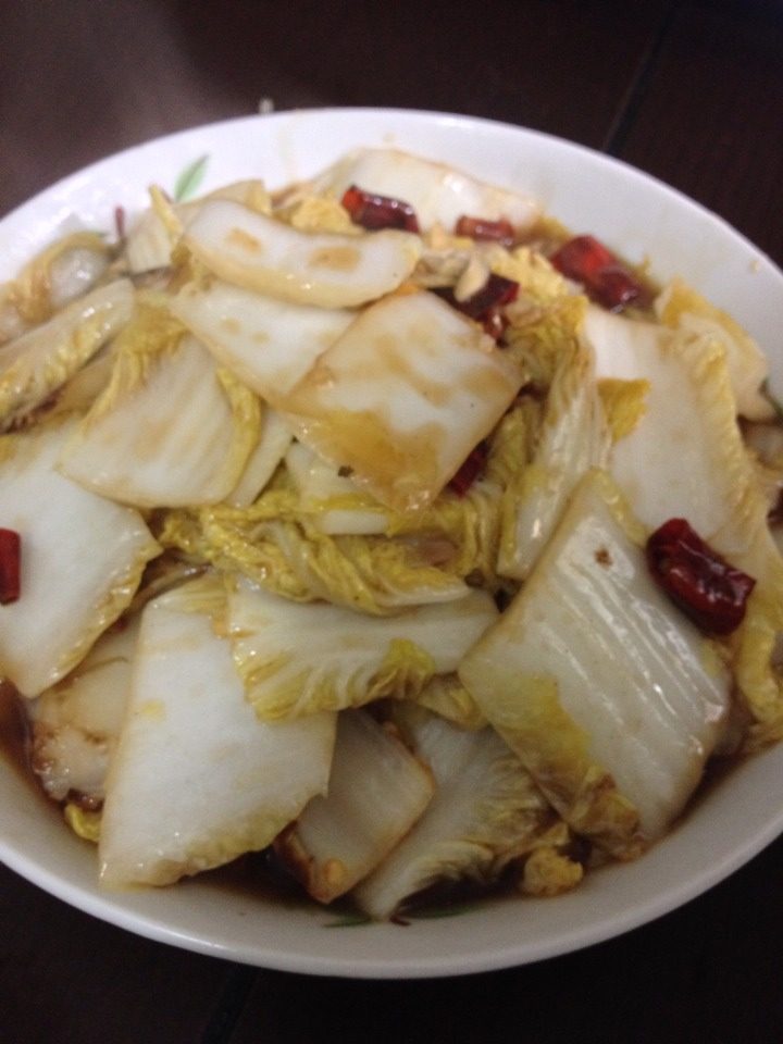 5:先放白菜帮,翻炒一下在放叶子,叶子放了之后放入调好的汁,大火翻炒