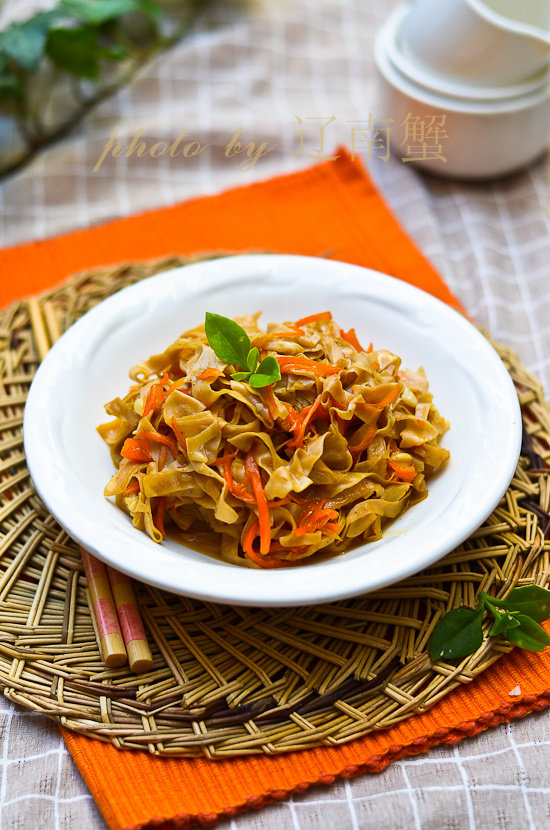 6:胡萝卜切丝,豆筋切丝,大蒜拍碎。