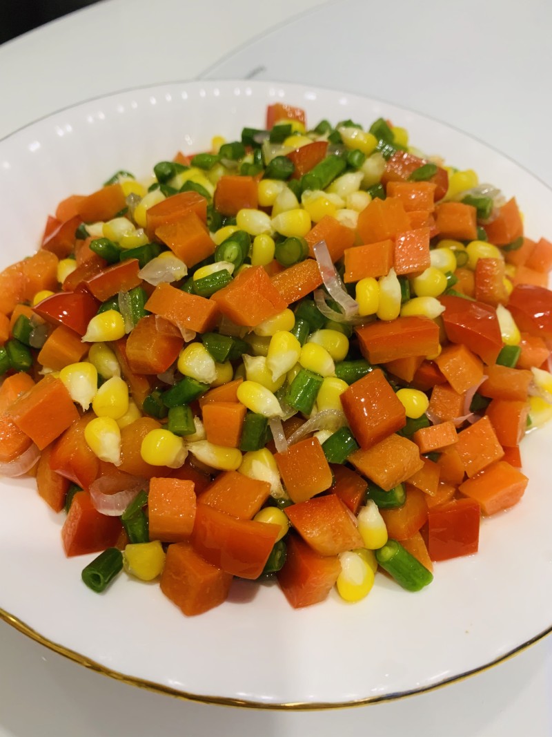 4:再把豌豆和胡萝卜丁焯熟,再过冷水备用。