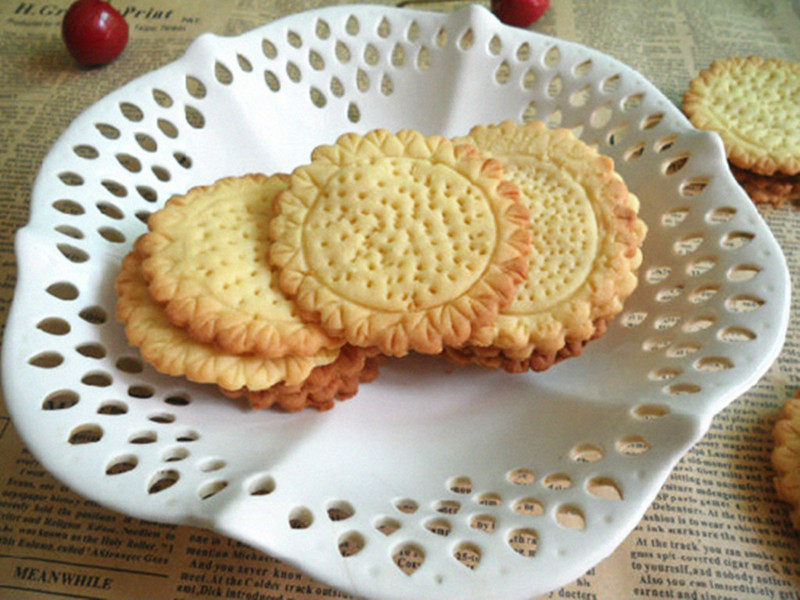 9:用牙签在圆圈外面压出花边,在圆圈里面扎出小洞,烤箱预热2分钟,开到160度,上下火,烤制15分钟即可