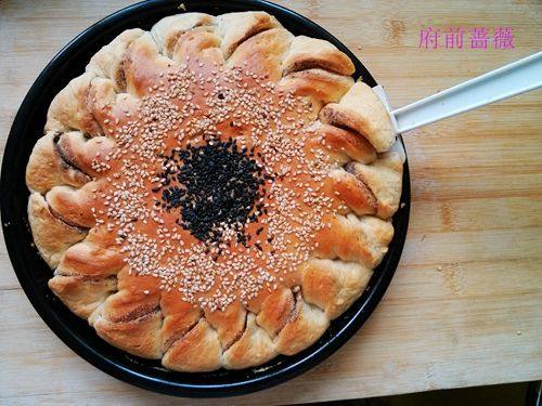 14:发酵至约1.5倍大小。表面刷纯奶,圆形内撒白芝麻,中心撒黑芝麻,再用刷子沾奶液轻按芝麻使其牢固。