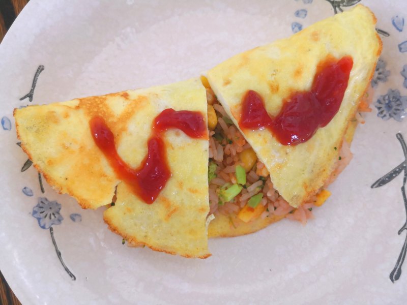 10:炒饭舀到蛋皮上,对折即可。
