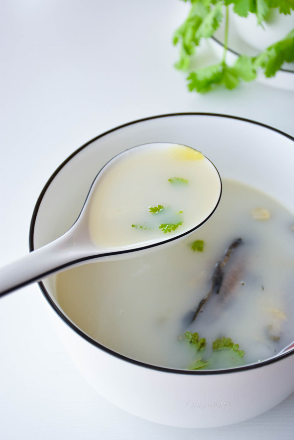 10:汤变白后加入盐调味,再放些香菜,葱即可。