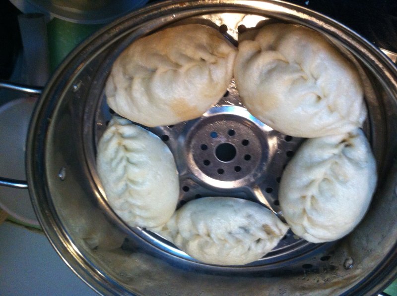 9:醒20分钟左右,冷水上锅开始蒸,我跟孩子喜欢吃软一点的蒜薹,蒸了25分钟。关火后3-4分钟再开锅,以免包子回缩