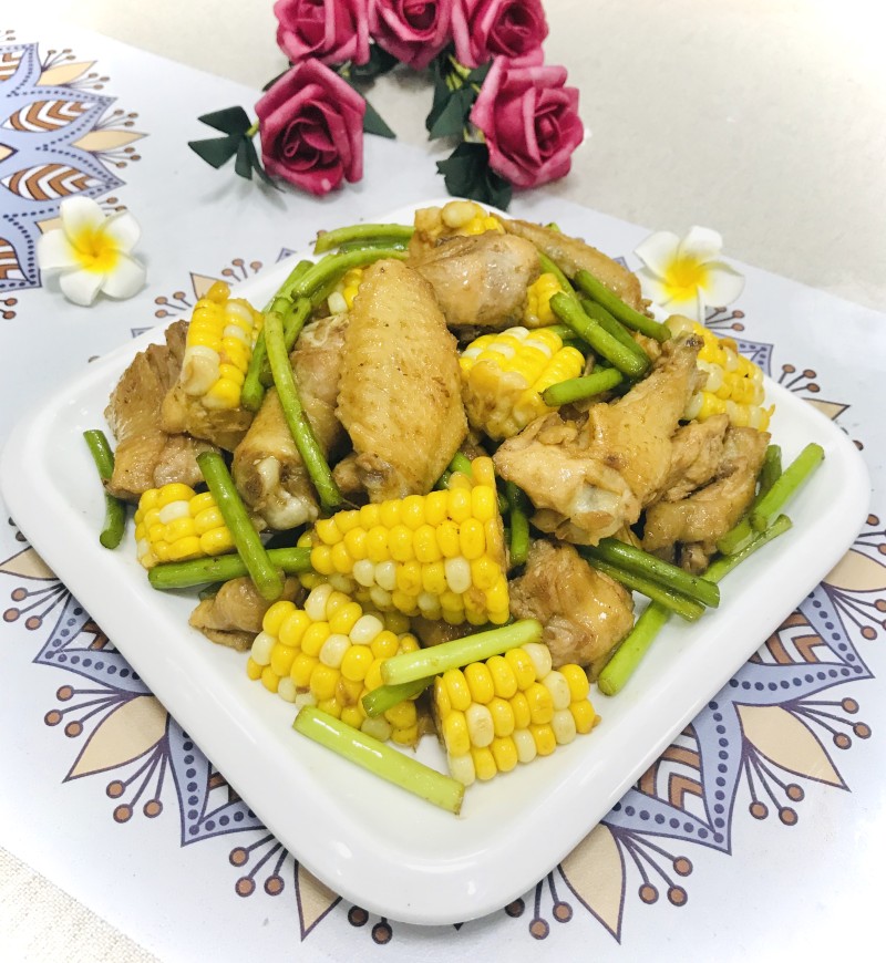 玉米蒜薹烧鸡块