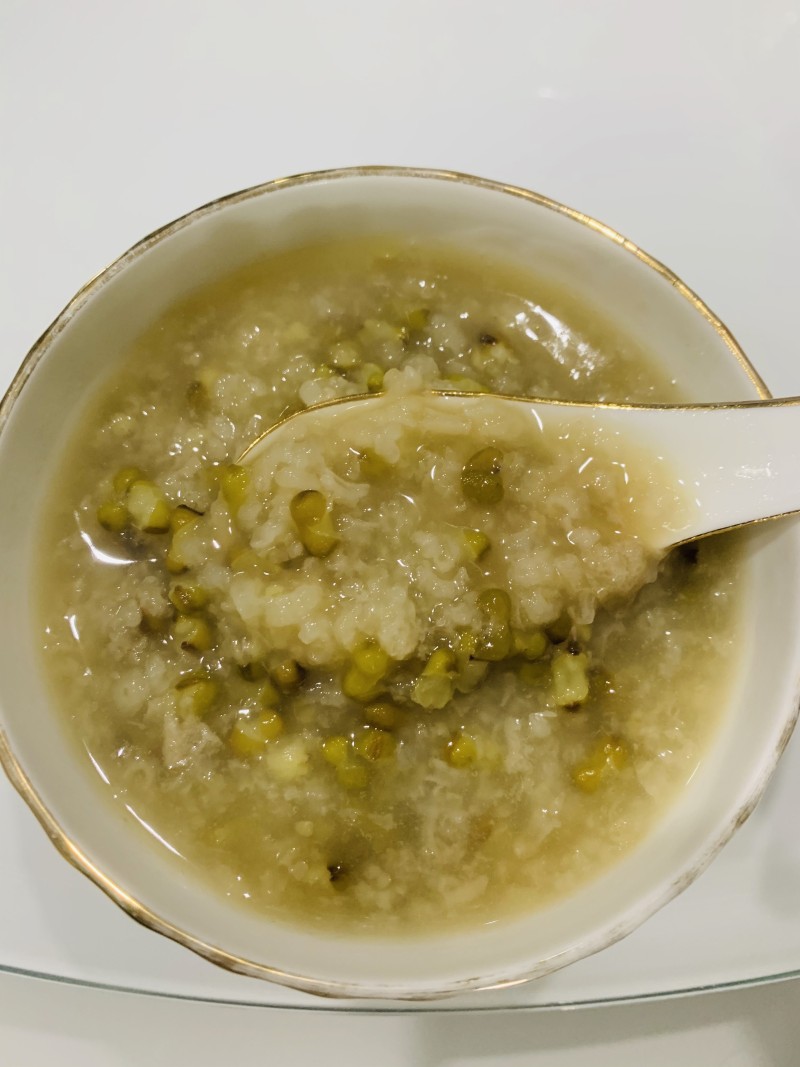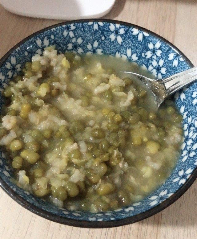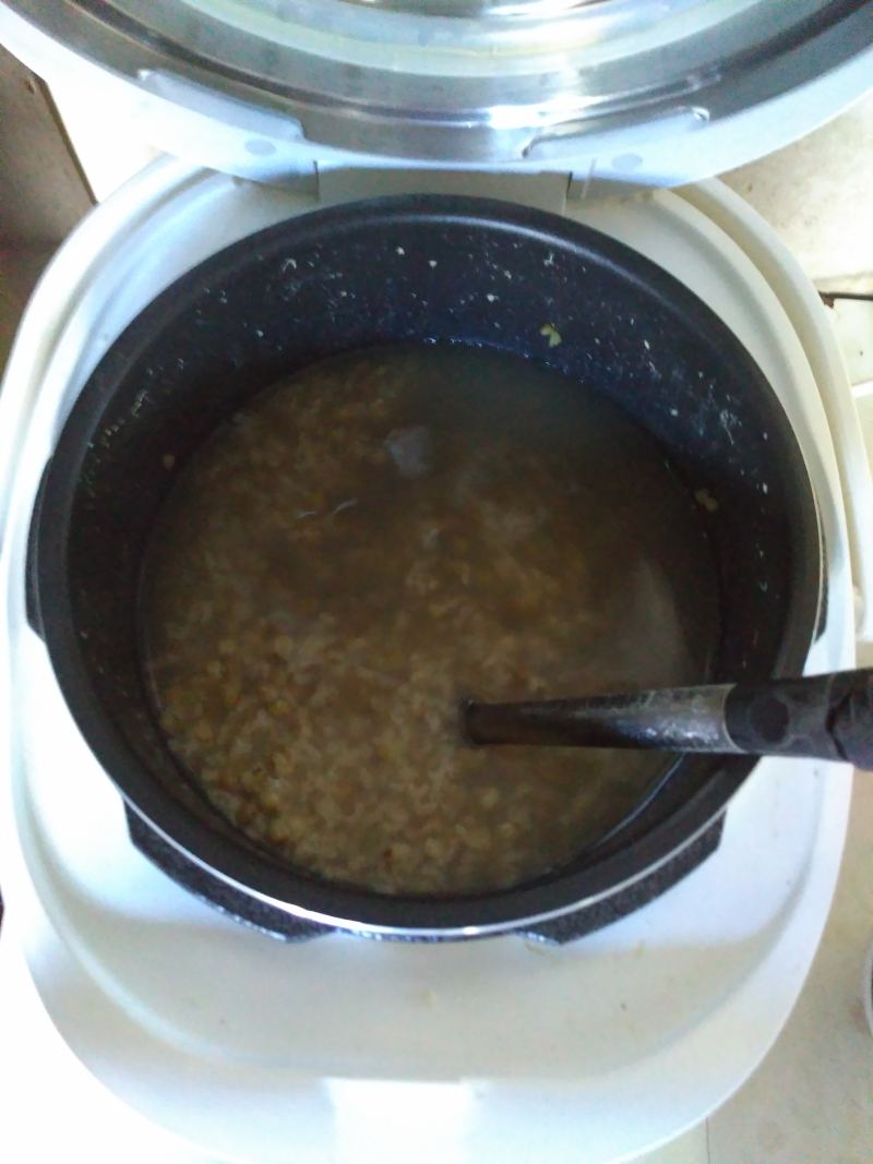 2:淘好的米和煮烂的绿豆放入锅中,找到婴儿粥煮两小时(没有的,可以用煮锅自己煮)。
