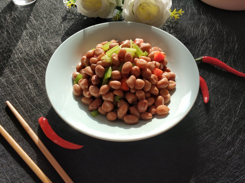 6:芹菜,花生米放入碗中,加入盐,糖白醋,蒜末,干辣椒淋上热油。