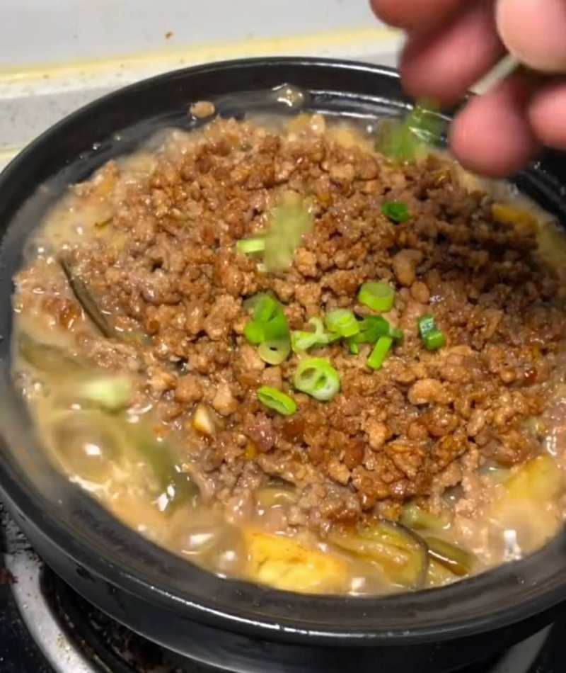 4:砂锅加入清水,上锅煮开,撒上葱花,茄子炖豆腐就完成啦。