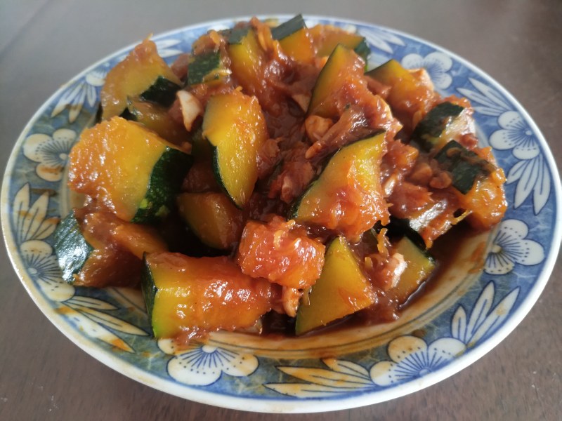5:锅烧热放适量油,倒入尖椒丝爆香,再倒入南瓜加少许盐和生抽调味,翻炒片刻即可。