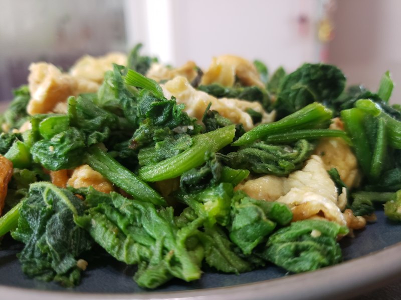 7:锅烧热放适量油,倒入蛋液,用铲子捣块,再倒入南瓜芽尖加少许盐和五香粉调味,翻炒几下即可。