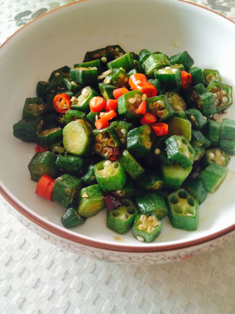 3:炒锅加少许油,将红辣椒爆香,放入秋葵片迅速翻炒,待成熟时烹入酱油适量。