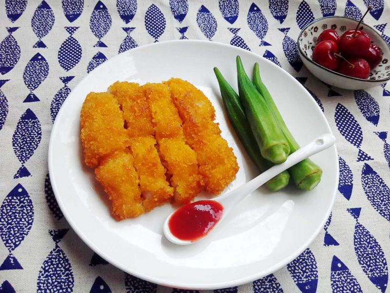 7:鱼排切小块入盘,摆上秋葵,配上蕃茄酱