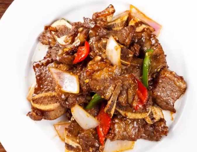 4:锅里留底油爆香蒜末,倒入牛仔骨,辣椒,洋葱翻炒均匀,加入盐,酱油,耗油,糖继续翻炒。