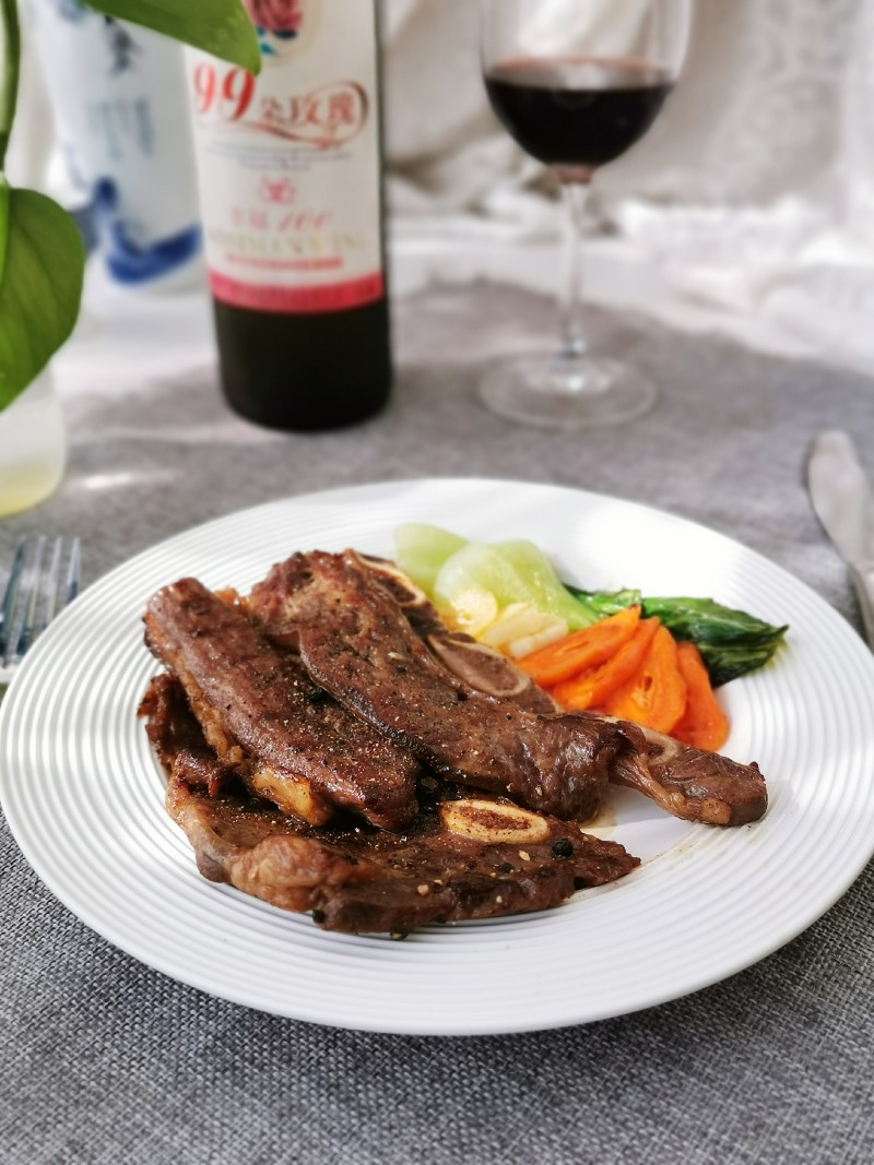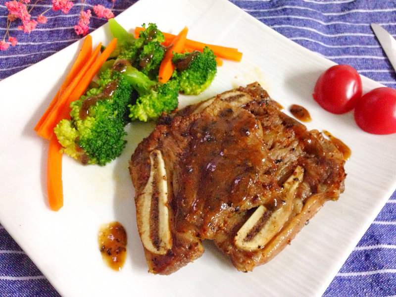 6:摆盘,牛仔骨洒黑胡椒,旁边放蔬菜即可享用。