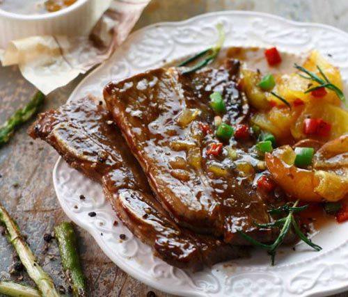 1:将牛仔骨泡净血水后洗净沥干水分,用烧烤酱、现磨黑胡椒碎和红葡萄酒抹匀腌制30分钟以上至入味。苹果洗净后和菠萝一起切厚片,厚度约在50px以内。芦笋洗净去掉老皮,入沸水焯一下。
