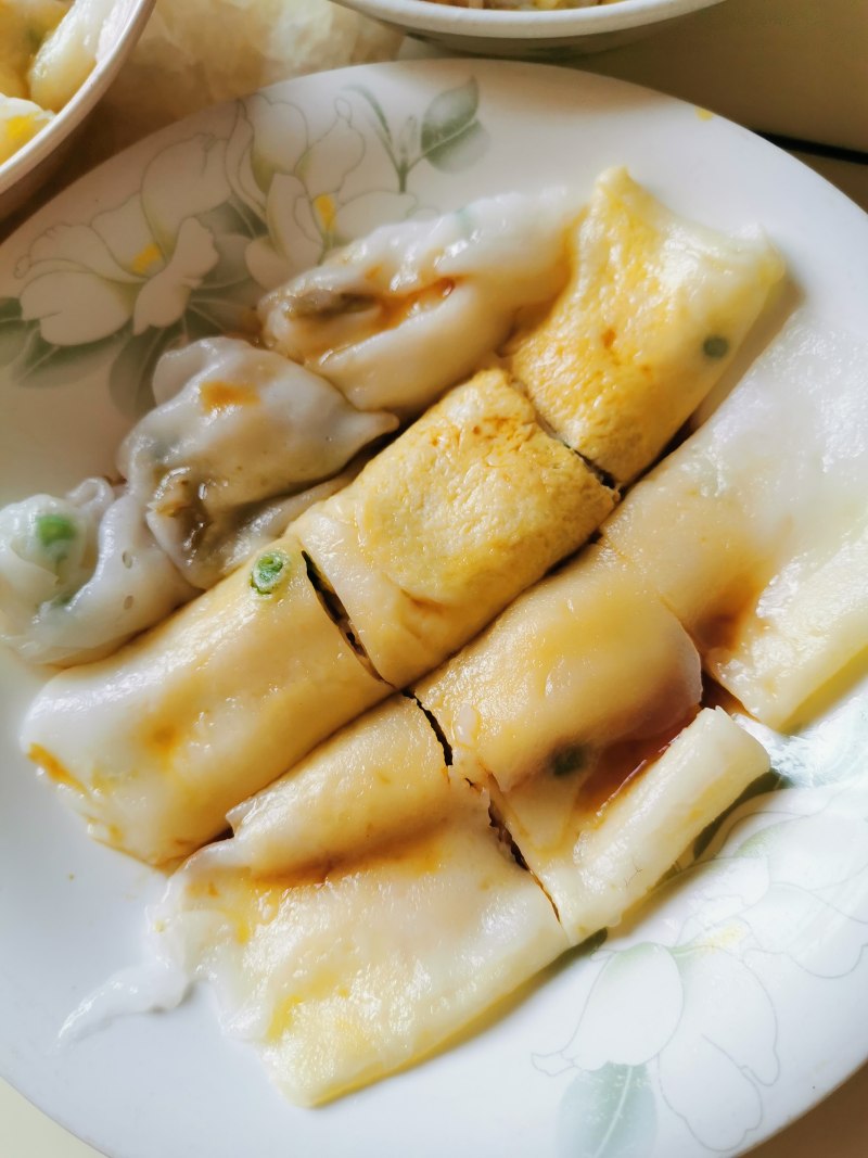 6:加上鸡蛋液的。不过直接在粉浆里加鸡蛋液的,出来肠粉会有点硬,可以先蒸粉浆,差不多熟再加鸡蛋液,这样最好吃。