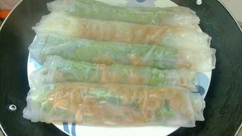 6:待锅内的水开了后,就可将卷好的肠粉放进去蒸,一般蒸五分钟即可