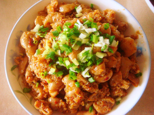 5:两小时后在肥肠上撒葱花香菜即可出锅了。