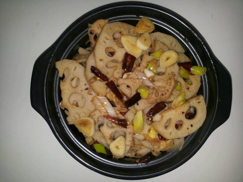 3:锅内放油油热放猪肥肉炸至金黄再放生姜大蒜朝天椒炒2下再放入藕片和青红辣椒放一勺盐2大勺醋大火快炒待8分熟放入青大蒜起锅
