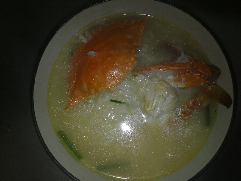 3:大米煮开之后把爆炒过的螃蟹倒进去,大火,粥第一次煮开后转小火慢炖,不过要记得常常搅拌一下,不然容易糊锅底~~有焦味就不好了,等粥煮软烂之后放盐、两三滴酱油(我们家都不吃味精、鸡精的),放点酱油鲜点,最后出锅前洒点葱花~手机一般,像素不怎么好,拍不出实物真正的色泽,实物是有点黄色的哟,看起来很有食欲
