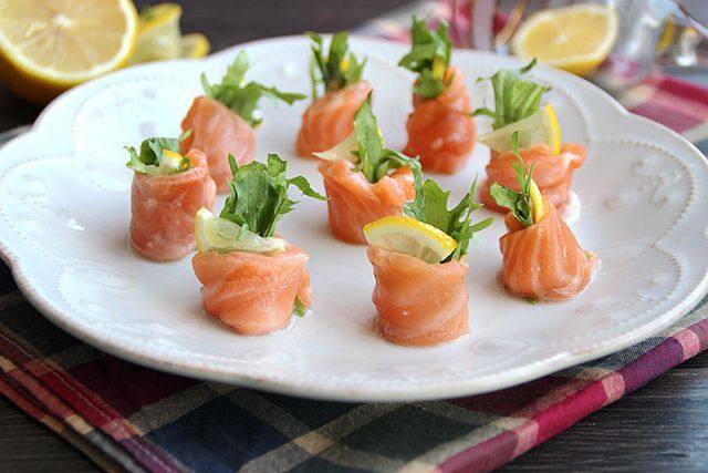 4:用三文鱼包裹住苦苣和柠檬片,卷起来。