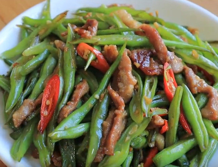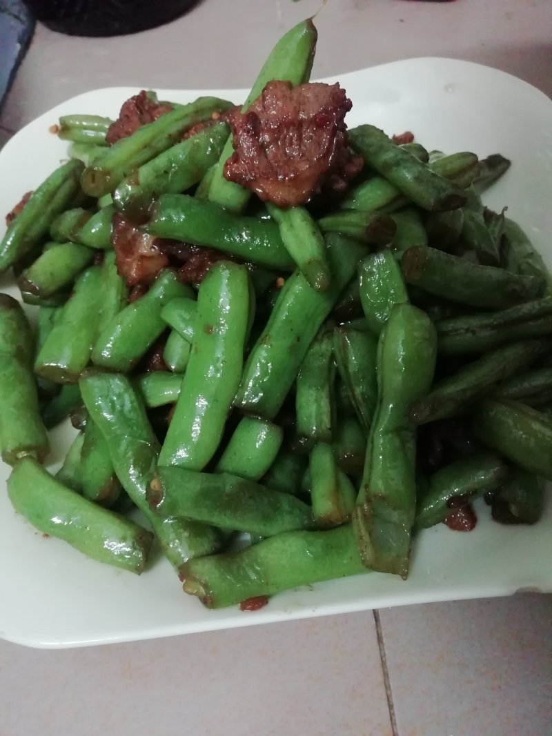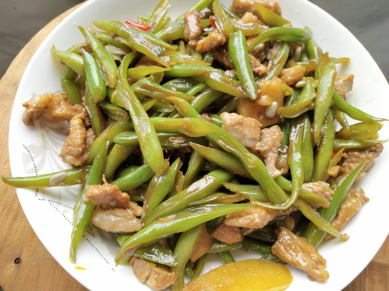 3:另起锅煎出油下瘦肉炒香,下蒜蓉、小辣椒翻炒出香味后下四季豆炒…炒至四季豆有些干煸后加入酱油、十三香翻炒两三分钟后加盐调味炒匀关火装盘。