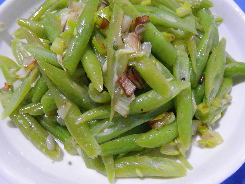 2:接着放入备用的四季豆,翻炒2分钟加入适量盐和味精调味即可。
