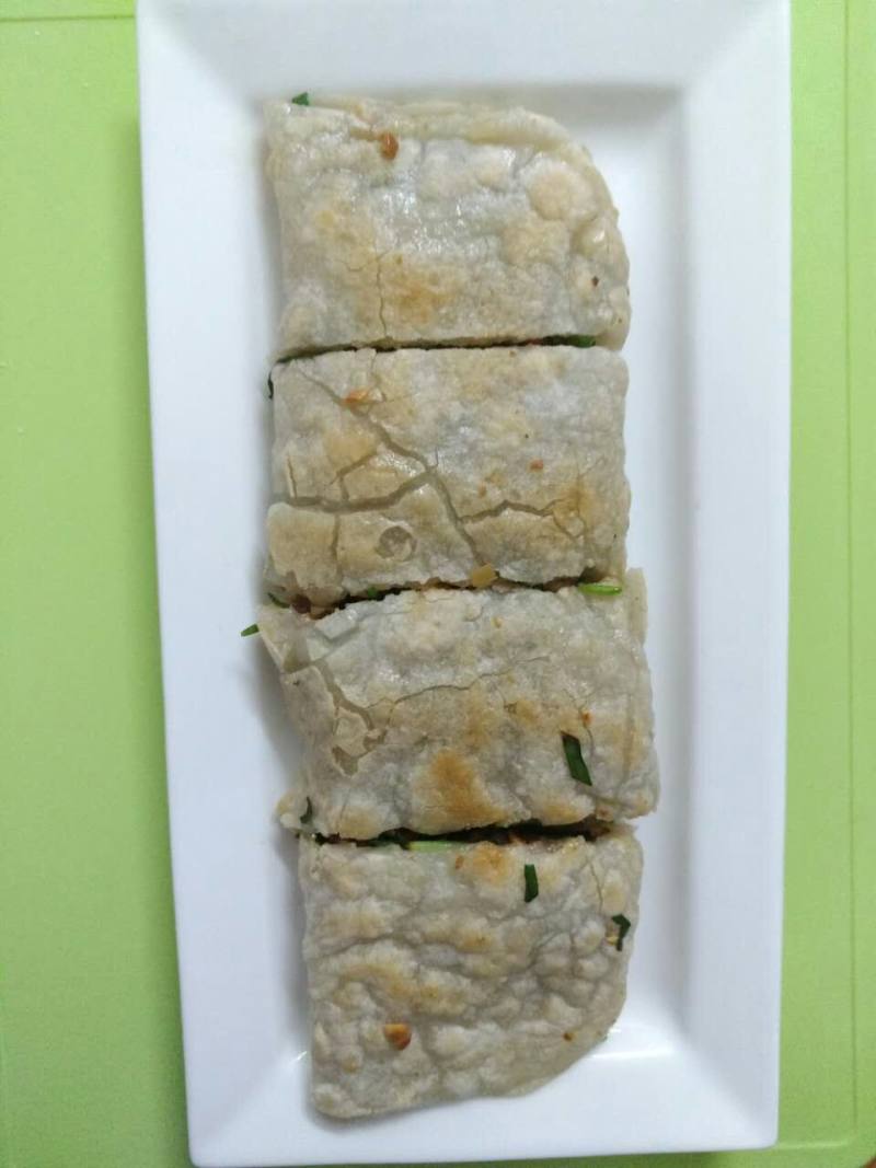 8:把煎好的锅贴夹上碟用小刀切四等份,外脆里软的韭菜锅贴做好啦
