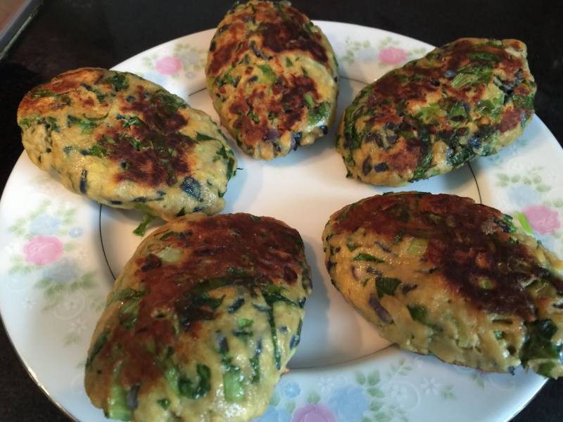 2:玉米面加黄豆面混合一下,油、鸡蛋,开水缓慢调和面粉,使其慢慢成絮状,凉凉了加入蔬菜碎和盐,揉搓成一个手掌大小的椭圆形面团,