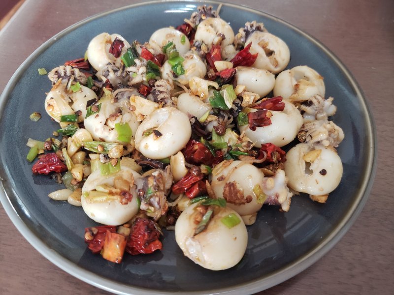 6:锅烧热放少许油,倒入葱姜蒜、麻椒和辣椒加少许盐爆香,再倒入墨鱼仔,大火翻炒一下即可。