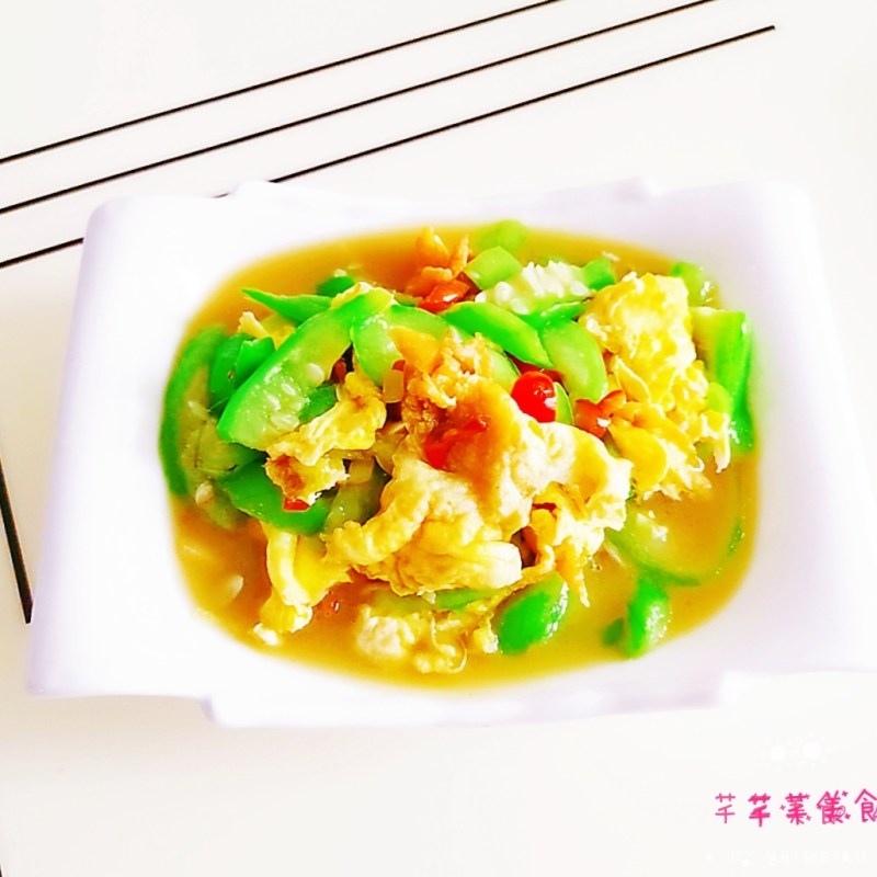 12:鲜嫩可口的丝瓜炒鸡蛋装入盘中就大功告成了。
