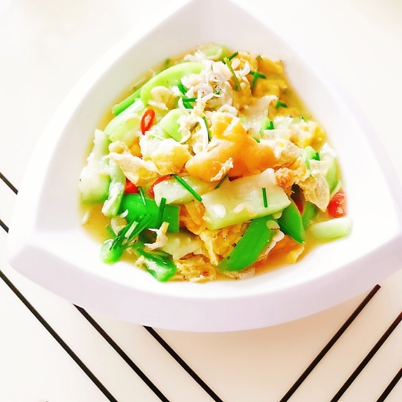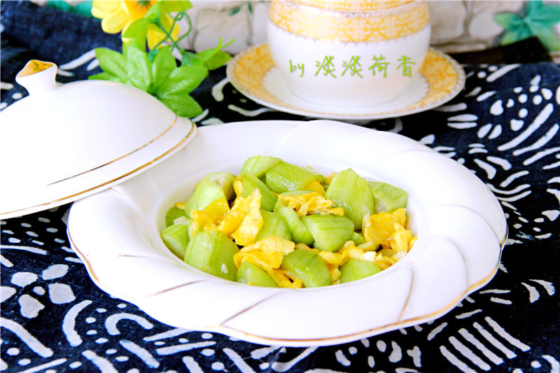 4:平底锅烧热倒入丝瓜翻炒,加点水烧至八分熟,倒入鸡蛋,加盐,收汁盛盘