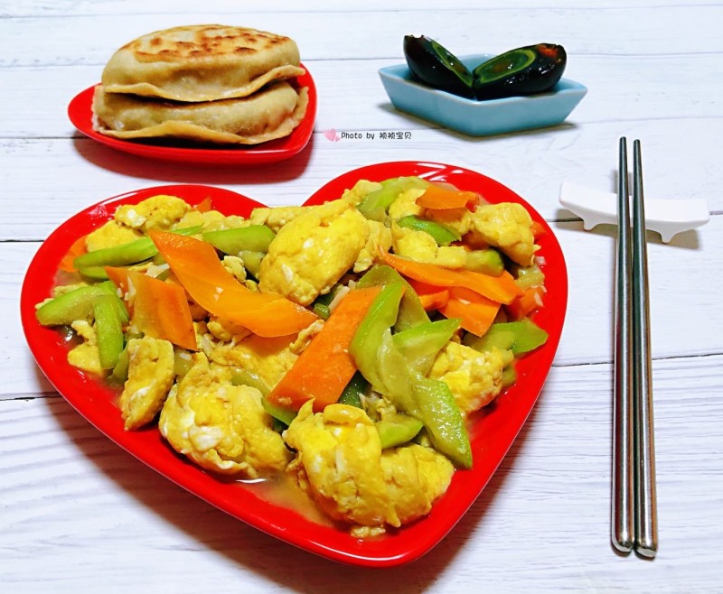 丝瓜1根;鸡蛋4个;胡萝卜30g;