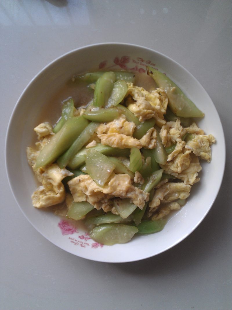 7:待丝瓜差不多熟后,将鸡蛋放到锅里翻炒几下即可出锅;