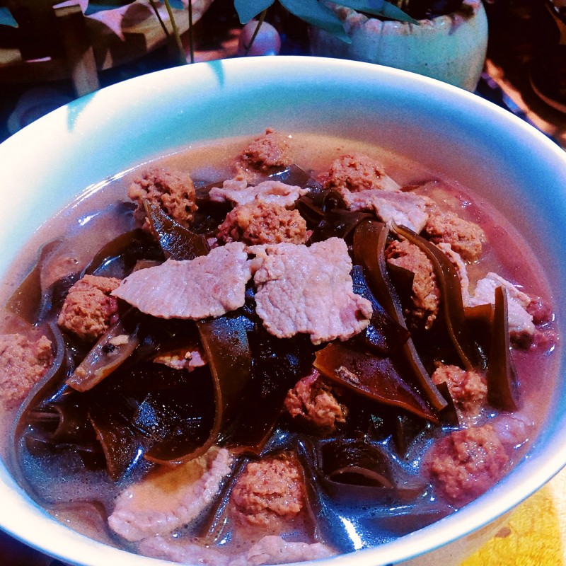5:把肉丸子汤倒入海带锅。加盐调味出锅。