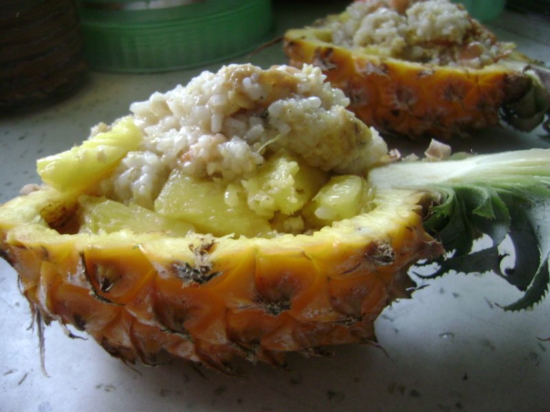 10:将炒好的菠萝虾仁饭填进菠萝中,即可。如果是宴客,效果还算不错。