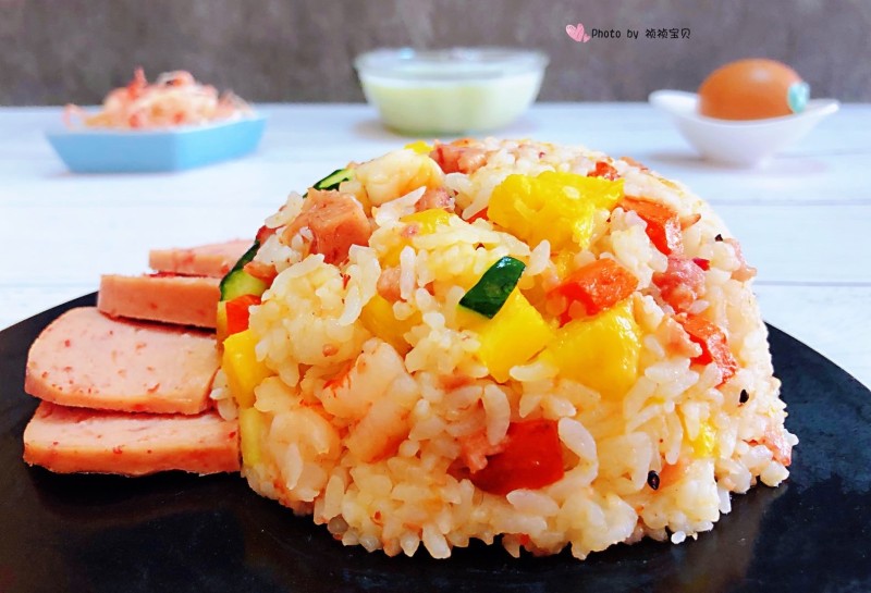 米饭1碗;菠萝50g;虾仁50g;午餐肉50g;黄瓜30g;胡萝卜30g;