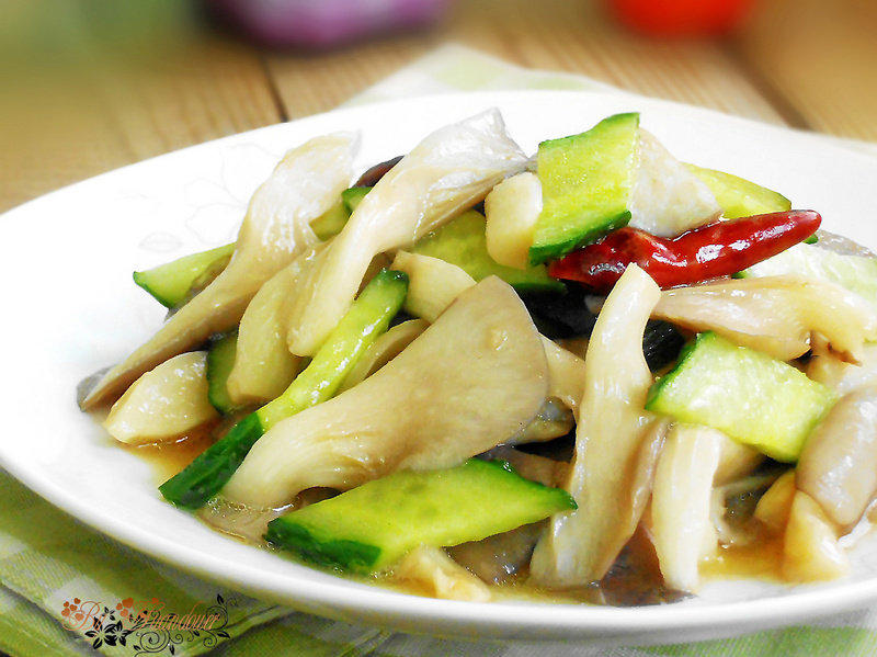 1:平菇和黄瓜;新鲜的平菇菇片边缘向内包裹,像小伞一样扣下来而且平整不开裂