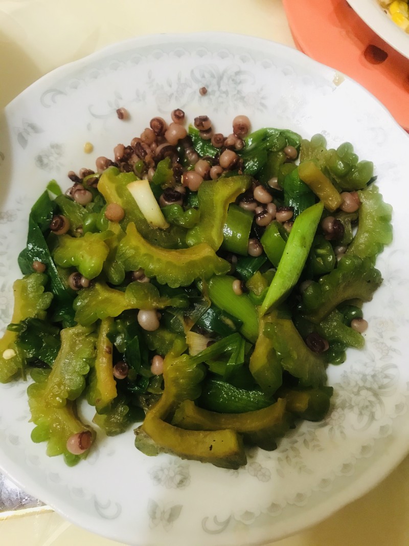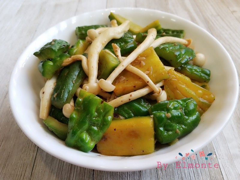 3:苦瓜焯水后,先炒海灵菇,再加苦瓜,放点酱油、盐、料酒、白糖,最后放大蒜、尖椒一点。