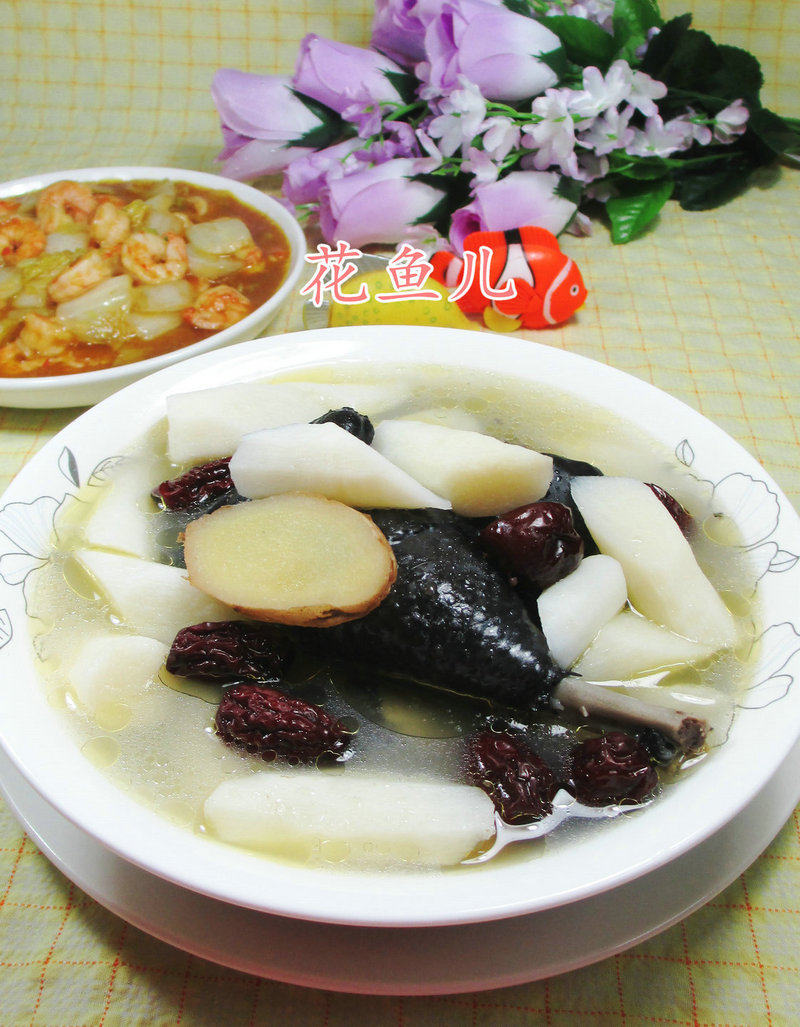 1:食材:乌鸡(已洗净剁开焯水)、山药(已清洗去皮切开)、红枣(已清洗)、姜片
